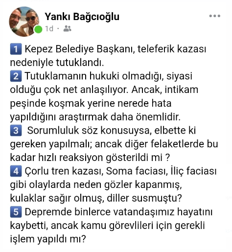 Antalya’da 1 kişinin yaşamını yitirdiği teleferik kazası ile ilgili dönemin ANET Genel Müdürü olan CHP Kepez Belediye Başkanı Mesut Kocagöz’ün de aralarında bulunduğu 5 kişi tutuklandı. Kocagöz’ün tutuklanma kararının duyulmasının ardından siyaset dünyasında tansiyon bir anda yükseldi. CHP Milli Savunmadan Sorumlu Genel Başkan Yardımcısı Yankı Bağcıoğlu Çorlu tren kazası ve 6 Şubat depremlerini hatırlatarak kamu görevlileri hakkında gerekli işlemler yapıldı mı diye hatırlatarak kararın siyasi olduğu çok açık vurgusu yaptı.
