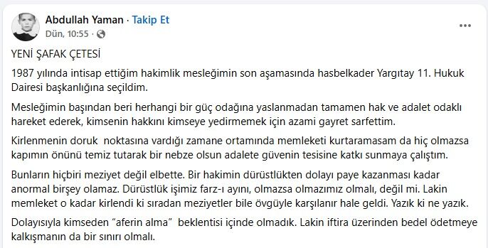Yargıtay 11. Daire Başkanı Abdullah Yaman'ın Facebook gönderisinin tamamı: