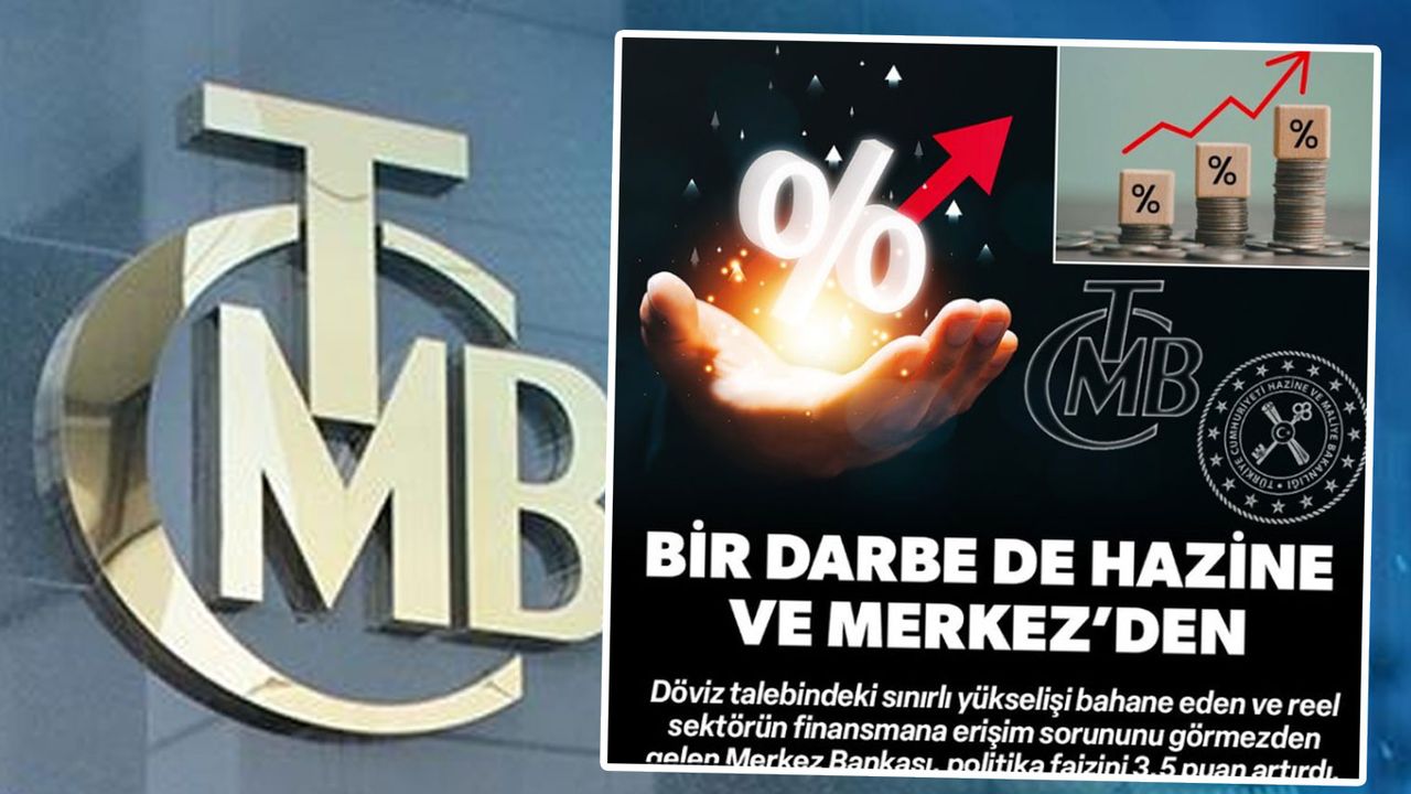 Yeni Şafak, sosyal medya hesabından yaptığı paylaşımda "Bir darbe de hazine ve merkezden" paylaşımıyla dikkat çekerken, "Döviz talebindeki sınırlı yükselişi bahane eden ve reel sektörün finansmana erişim sorununu görmezden gelen Merkez Bankası, politika faizini 3,5 puan artırdı" ifadelerine yer verdi.
