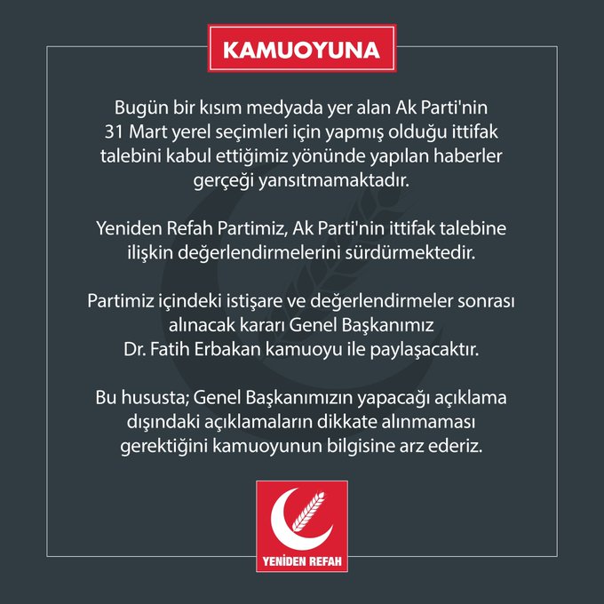 Yeniden Refah Partisi sosyal medya hesabından yaptığı açıklamada görüşmelerin devam ettiğini duyurdu.