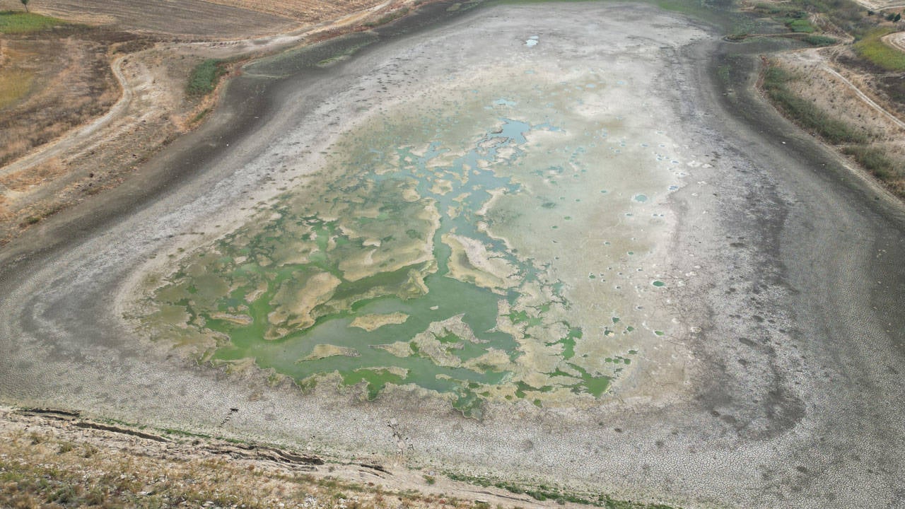 Tekirdağ’ın Muratlı ilçesi Yeşilsırt Mahallesi’nde yer alan ve hayvanların su ihtiyacını karşıladığı gölet, aşırı sıcaklar ve yağışsız geçen yaz nedeniyle ciddi şekilde kurudu.
