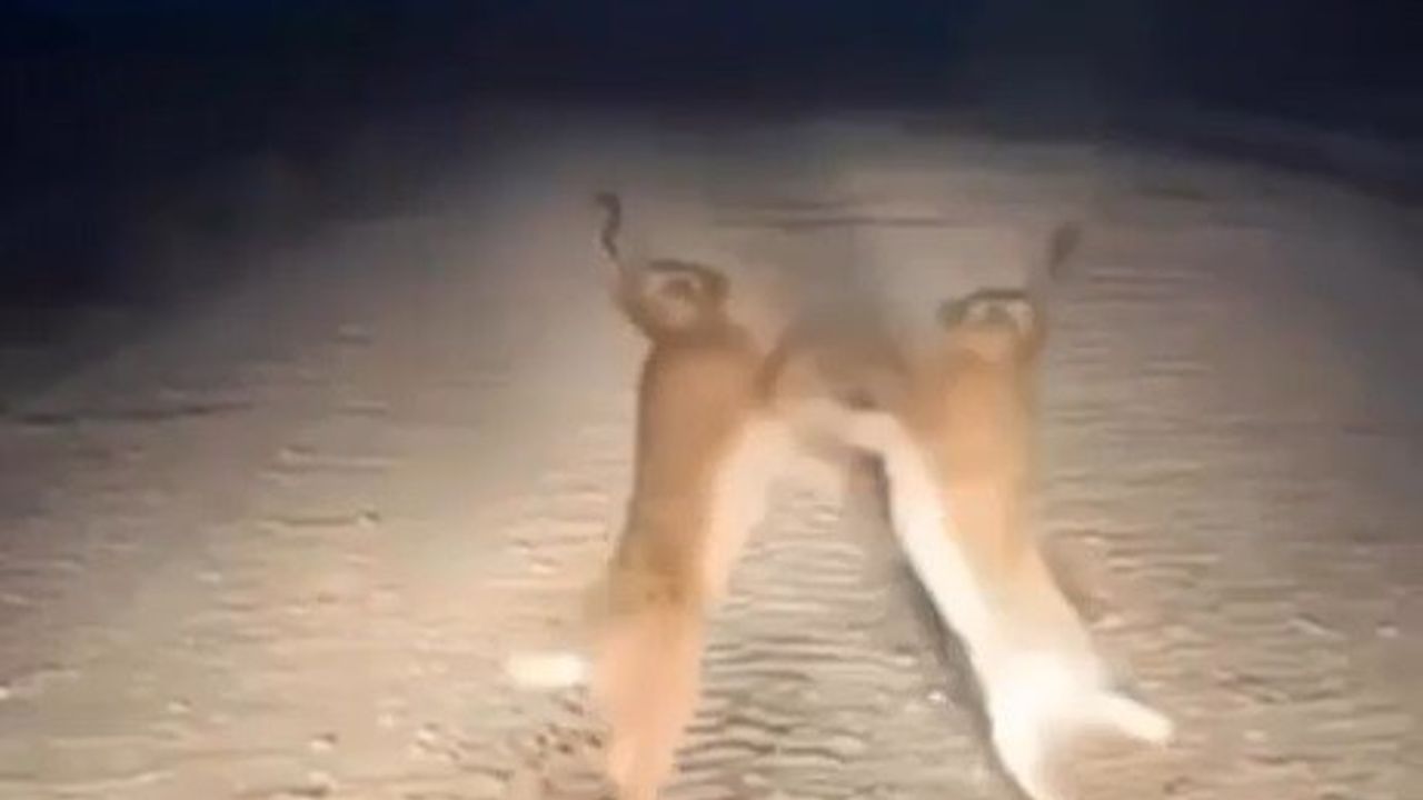 Bayburt’un Aydıntepe ilçesinde ilginç ve doğa severleri şaşırtan bir an yaşandı. Kırsal alanda yol ortasında karşı karşıya gelen iki yaban tavşanı, adeta bir boks maçını andıran kavgaya tutuştu. O anlar, tesadüfen yoldan geçen bir sürücünün cep telefonu kamerasıyla saniye saniye kaydedildi.