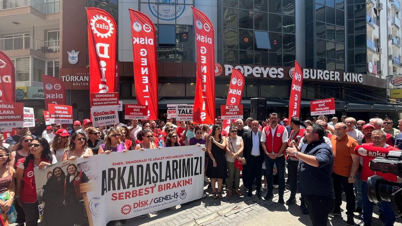 Gümüştekin ve Bilir’in tutuklanmasının ardından DİSK Genel İş İzmir’de sokağa indi. Bugün Kıbrıs Şehitleri Caddesi’nde bulunan Türkan Saylan Kültür Merkezi önünde basın açıklaması gerçekleştirildi. Basın açıklamasını okuyan DİSK Genel İş Örgütlenme Dairesi Başkanı Ali Haydar Kaya, "İzmir’de, İstanbul Büyükşehir Belediye Başkanı Ekrem İmamoğlu’nun tutuksuz yargılanmasına yönelik bir basın açıklamasında, İzmir 8 No’lu Şube Başkanımız Deniz Şahin Gümüştekin ve Şube Kadın Komisyonu üyesi Mine Bilir “Cumhurbaşkanına hakaret” suçlamasıyla tutuklanmıştır. Bu tutuklama sadece iki sendika yöneticisine değil, doğrudan sendikal hak ve özgürlüklere, ifade özgürlüğüne ve emek demokrasi mücadelesine yönelmiş açık bir gözdağıdır. Bu hukuksuz uygulama, ülkeyi yönetenlerin kendilerinden farklı düşünenleri bastırma ve örgütlü mücadeleyi sindirme çabalarının yeni bir örneğidir" dedi.