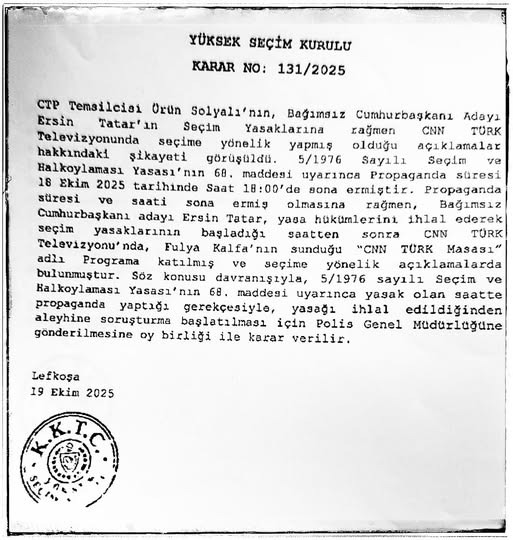 Propaganda süresi sona ermiş olmasına rağmen, bağımsız cumhurbaşkanı adayı Ersin Tatar’ın, yasa hükümlerini ihlal ederek seçim yasaklarının başladığı saatten sonra CNN TÜRK televizyonunda, Fulya Kalfa’nın sunduğu “CNN TÜRK Masası” programına katılarak seçime yönelik açıklamalarda bulunduğu tespit edilmiştir.