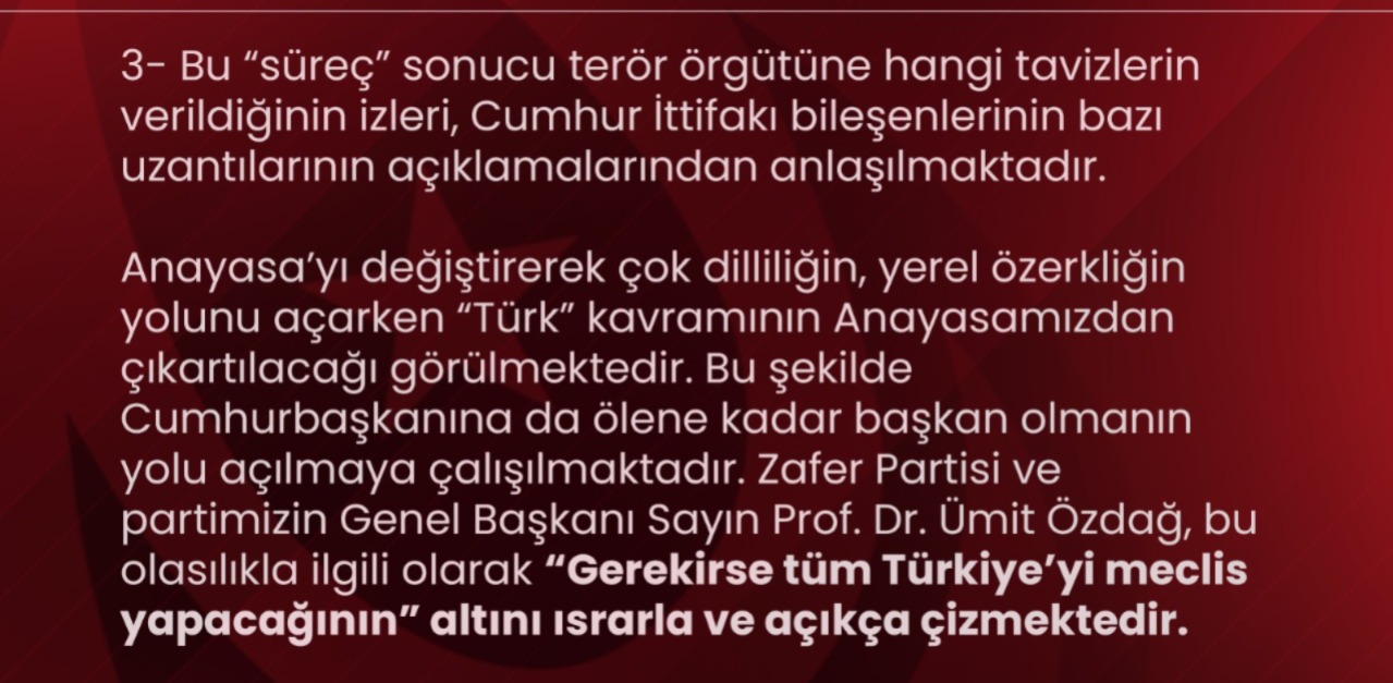 Parti açıklamasında, sürecin Türkiye’nin geleceği açısından tehlikeli sonuçlar doğurabileceğine dikkat çekilirken, Zafer Partisi’nin ve Özdağ’ın “bebek katiliyle sürdürülen süreç” konusundaki net tavrının değişmediği vurgulandı. Açıklamada, partinin bu süreci açıkça ihanet olarak değerlendirdiği ve Türkiye’nin birlik ve bütünlüğü için her koşulda mücadele edecekleri ifade edildi.